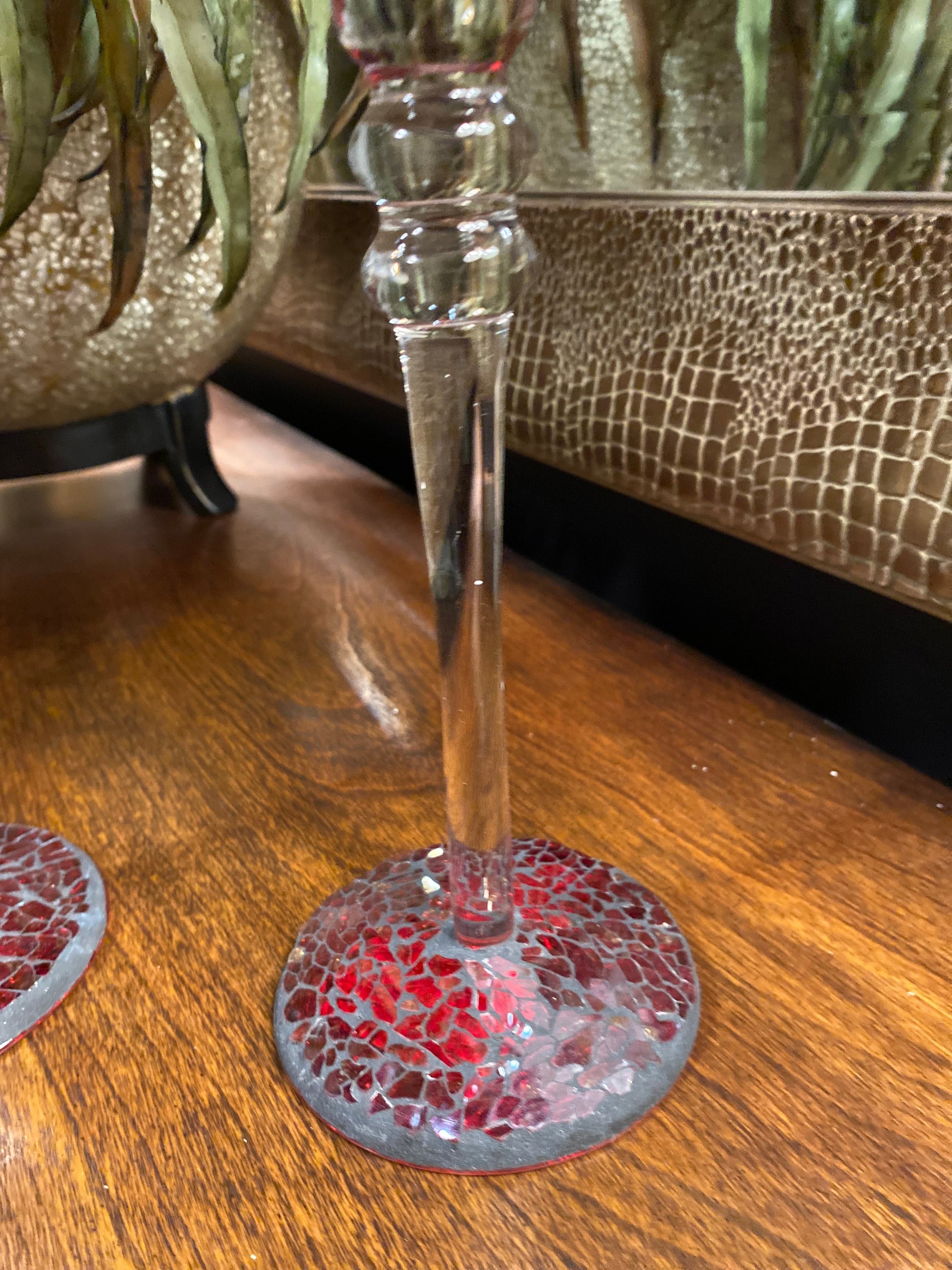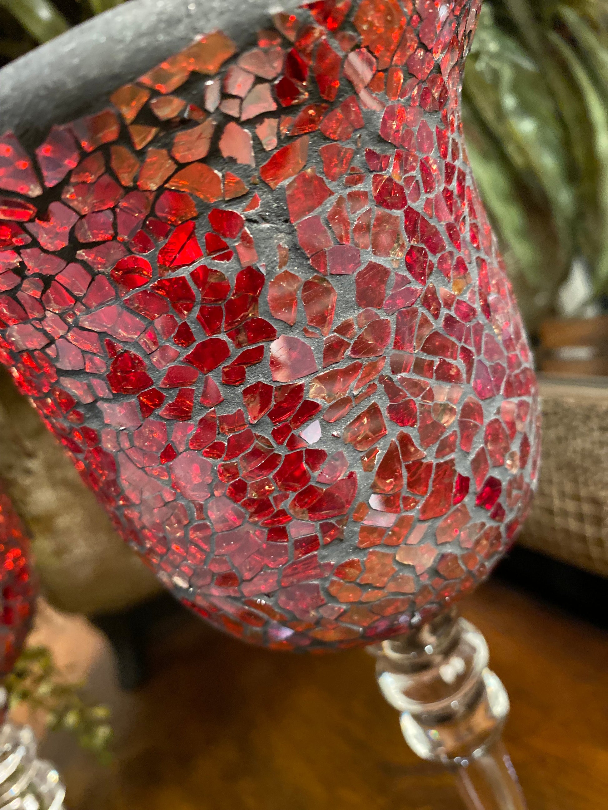 A set of 2 Crackle red mosaic glass pedestal candle holders H 12"